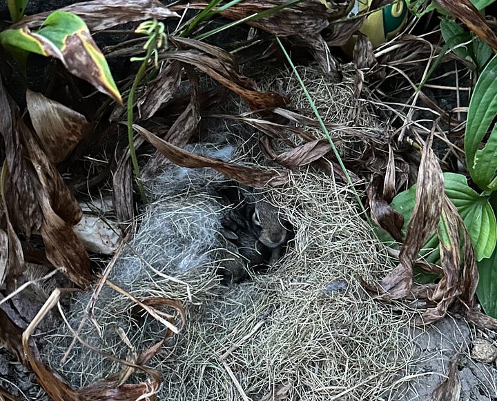 Bea hadn’t been going after moles, but someone far cuter. A baby bunny a few days old, maybe just a day old, peeked back at me from a cozy nest with her three siblings.