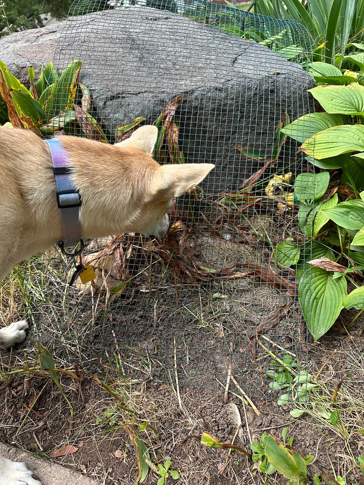 Tiny baby bunnies. Barely moving. I knew mama bunny wouldn’t come during the day, not with so much dog activity, so I placed wire mesh over the nest, resting on the big rock.